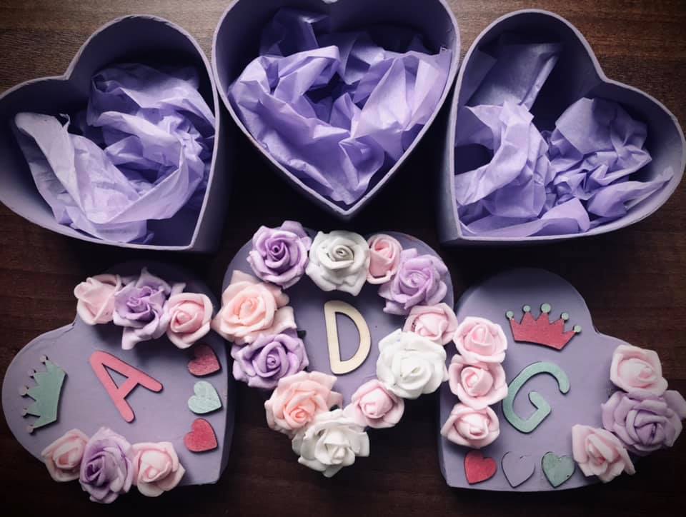 The boxes are made with Mache and are decorated with beautiful foam flowers with any initial added.